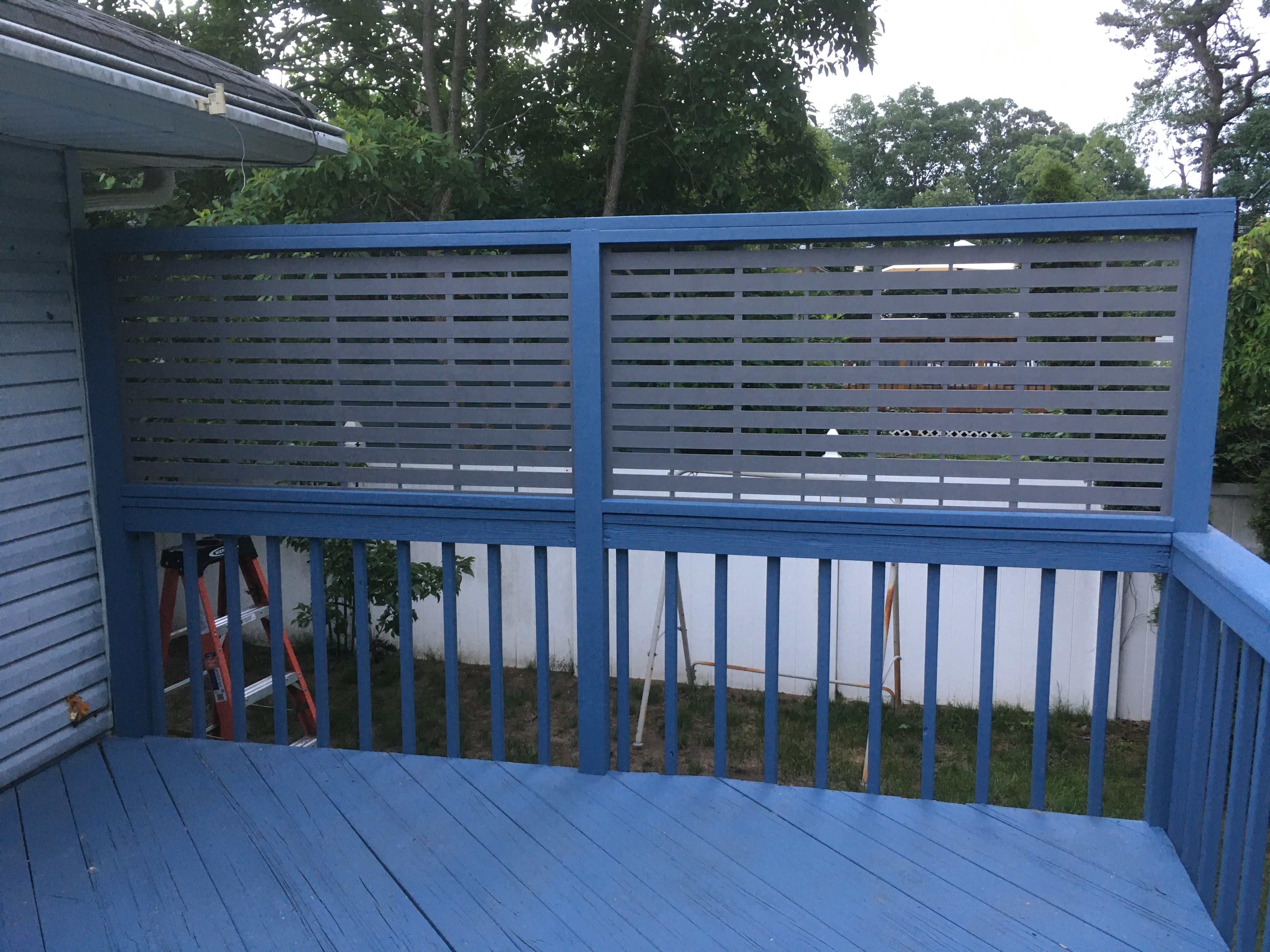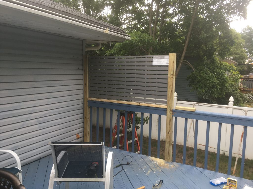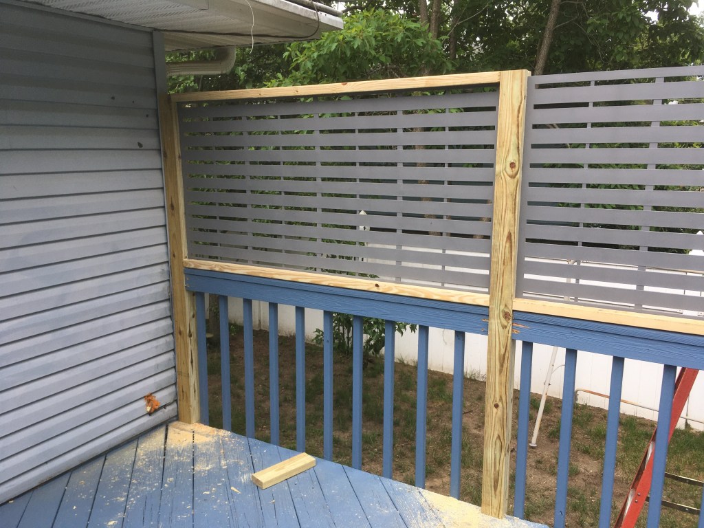 Deck privacy screen built into an existing deck. The existing 4″x4″ posts on one side were removed and replaced with PT 8′ spans, framed with PT 2’x4’s and painted to match the rest of the structure.